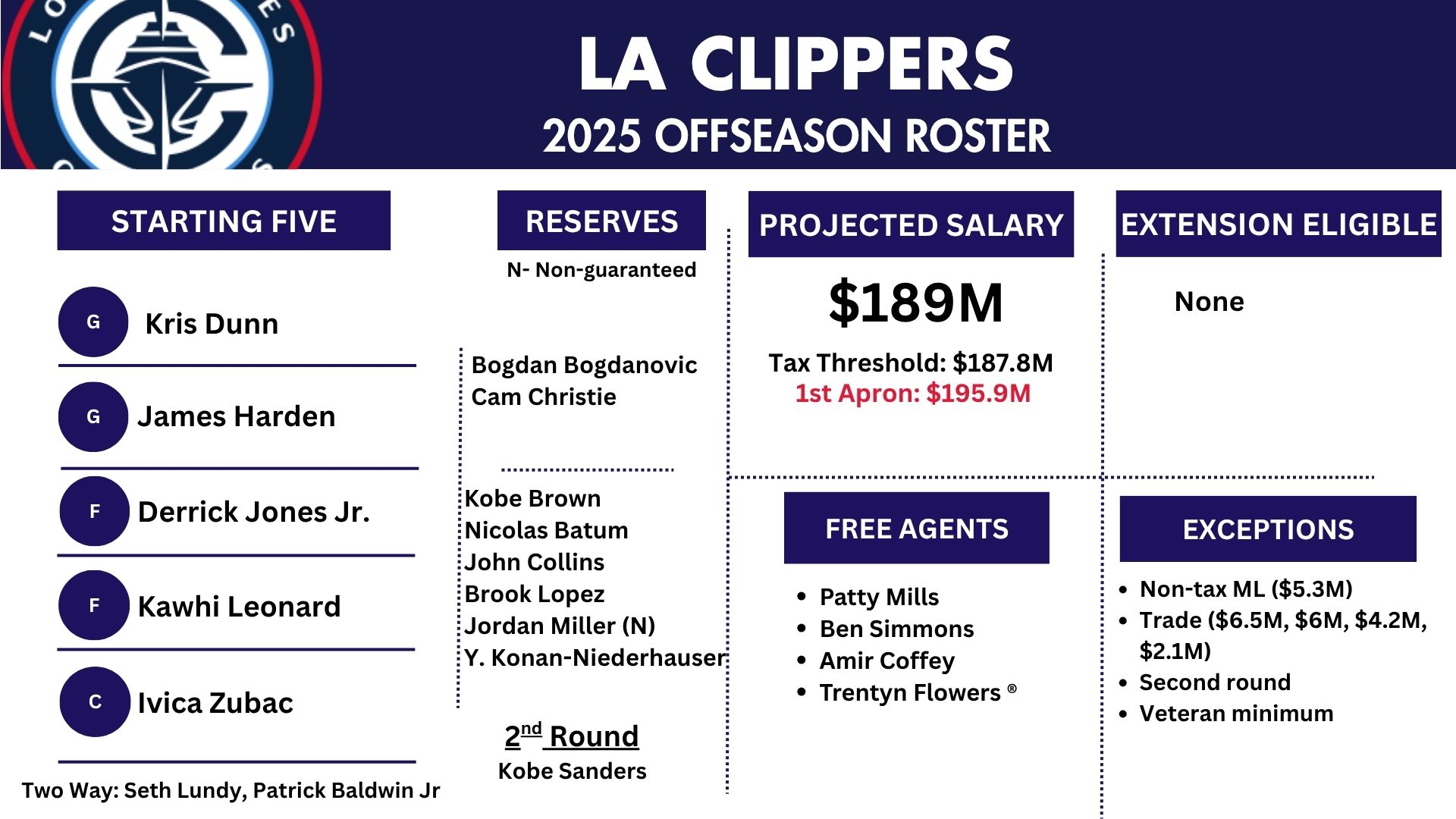 目前,快船的资产还剩下部分全额中产(530万美元)、交易特例(650万美元、600万美元、420万美元、210万美元)、二轮秀签约、老将底薪。