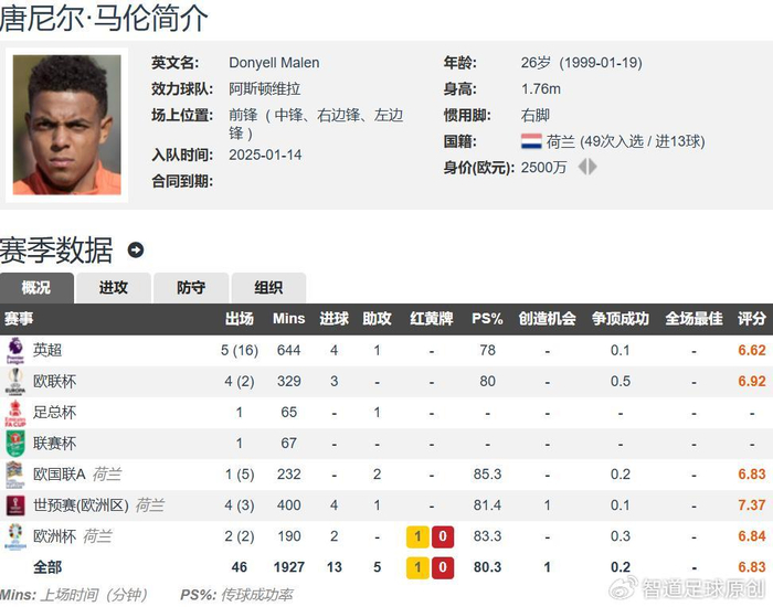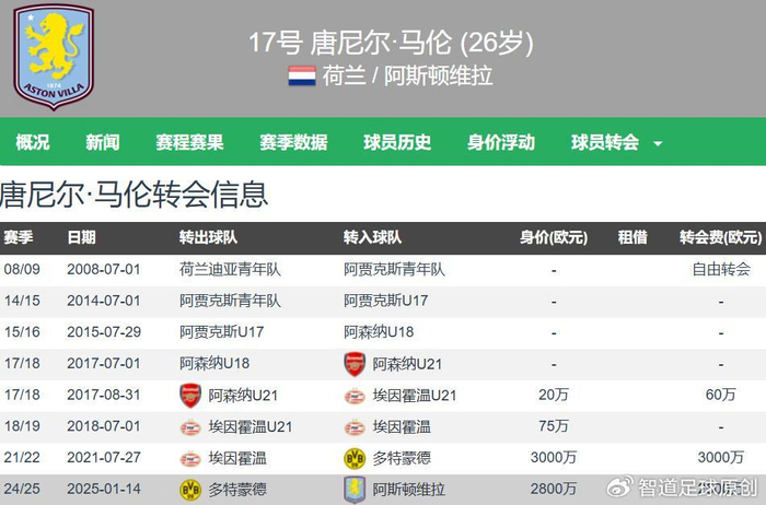 阿斯顿维拉于2025年1月以2500万欧元的转会费从多特蒙德签下马伦,罗马200万欧元租借+2500万欧元的买断费用,等于阿斯顿维拉不亏,小赚200万欧元。