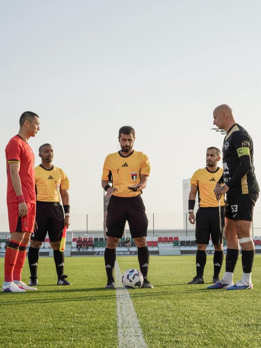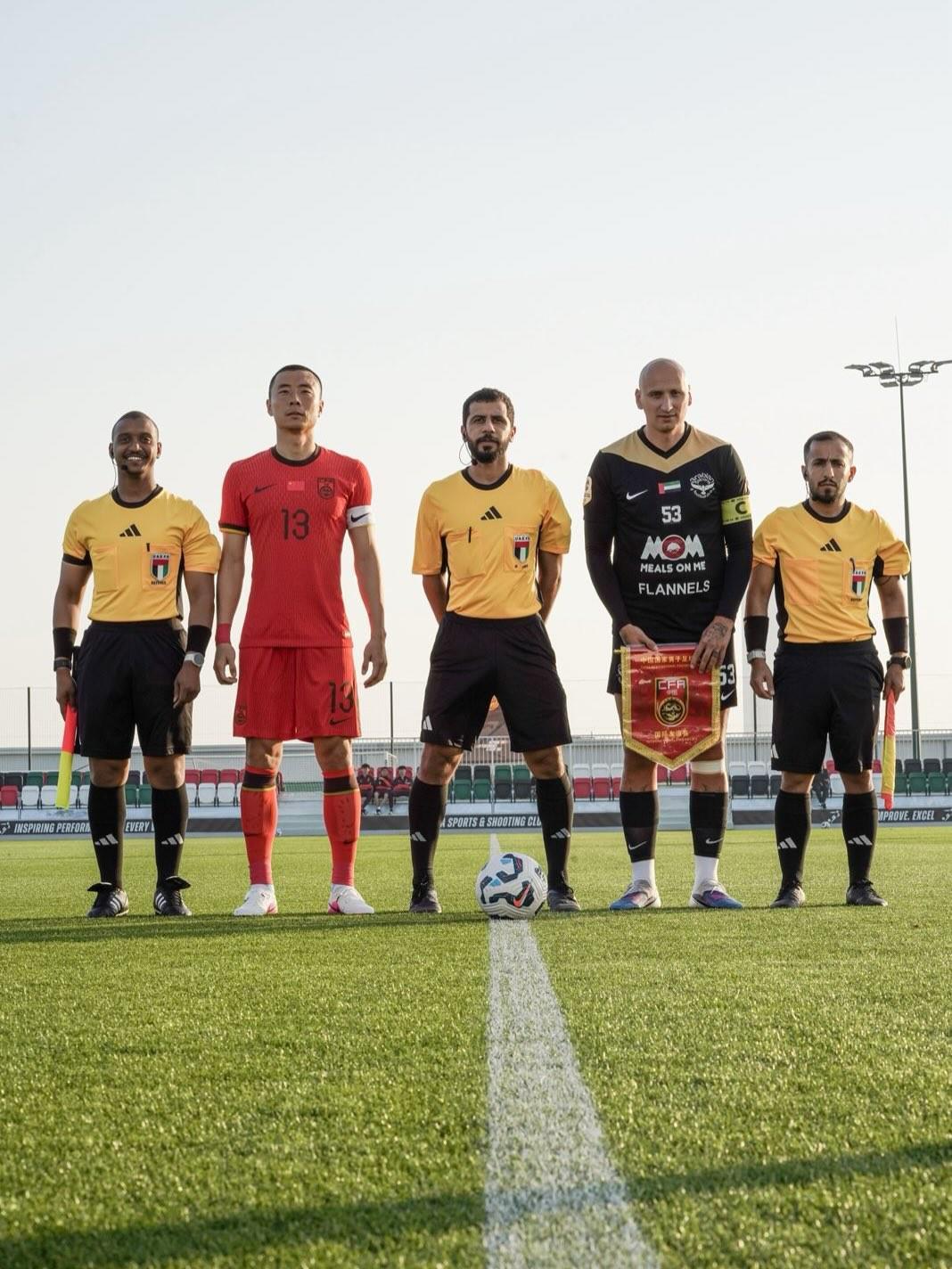 据阿拉伯猎鹰官方分享的照片显示,国足的队长是李磊,而阿拉伯猎鹰队长是谢尔维。