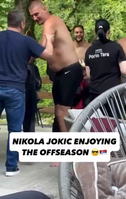 视频中的约基奇赤膊上身,喝着饮料,十分惬意。不过,看上去大肚子十分明显。
