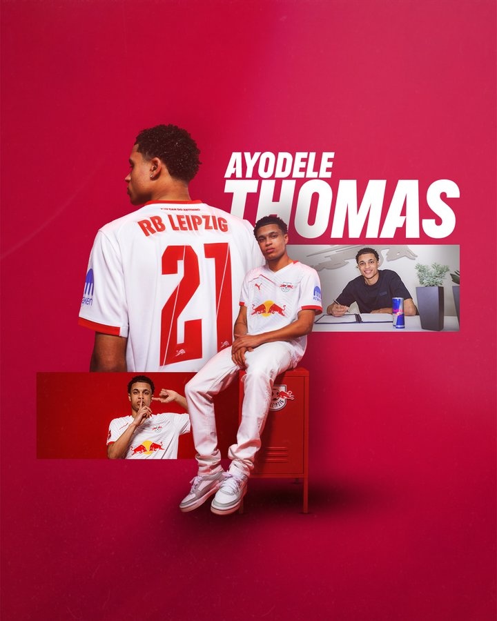 公告写道:“RB莱比锡签下攻击手阿约德勒·托马斯,这位18岁的球员从埃因霍温转会而来,与RB莱比锡签约至2031年,他将身披21号球衣。”
